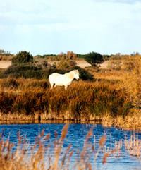 Just to the north of Arles, Provence's chief Roman metropolis, the Rhône river divides into two: to the west the "Petit Rhône" flows down to the "petite Camargue", Aigues Mortes, and les Saintes-Maries-de-la-Mer, and to the east the "Grand Rhône" which embraces the salt works (Salin de Giraud) and the petro-chemical industrial complexes of Port Saint-Louis, Port de Bouc, and Fos sur Mer. Between and around them lies the vast delta of salt marsh known as the Camargue National Park.