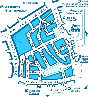 Les Thermes La Tourreluque Hôtel Maynier d'Oppède Hôtel de Chateaurenard Hôtel d'Estienne-de-St-Jean, Musée du Vieil Aix Hôtel de Ville Place de l'Université Place des Cardeurs Place des Pontètes Place de l'Hôtel de Ville