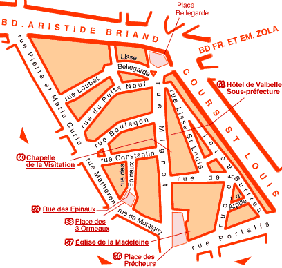 Chapelle de la Visitation, ou Sainte Catherine Eglise de la Madeleine Hôtele de Valbelle, sous-préfecture Place des trois Ormeaux Place des Prêcheurs Rue des Epinaux