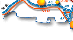 | Modern traffic whisks briskly by on its way from Nice, Marseille, Paris, and the Alps, hugging the ancient Roman ways favoured by the early carriageways. The famous N. 7, <nationale sept > which once lumbered through every village and small town on the way to Nice from Paris has been doubled by modern highways <autoroutes> which crisscross its path. |